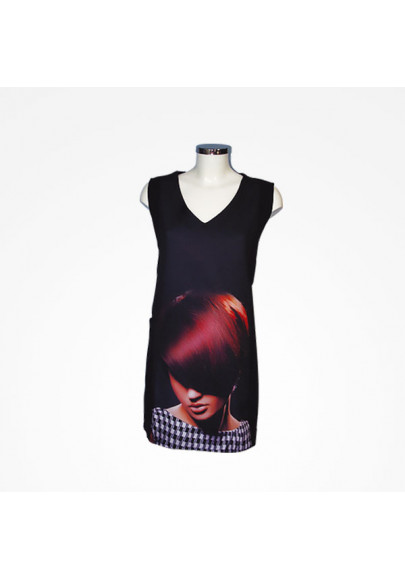 Chaqueta negra estampada. Ancho ajustable, manga corta, cuello forma V, con velcro interior, dos bolsillos laterales y frente estampado.