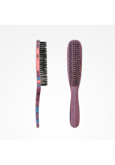 Cepillo único en el mundo. Diseñado con un arco que sigue la forma natural de la cabeza para una mejor experiencia de peinado. La cabeza del cepillo es curvada y permite la ventilación. Contiene 50 púas flexibles con cerdas de jabalí natural que suavizan, limpian y agregan brillo al cabello. Ideal para el secado y conseguir más volumen en el cabello. No daña el cabello ni produce tirones.