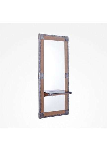 Tocador de pared con espejo rectangular con borde metálico y tachuelas. Estante centrado.