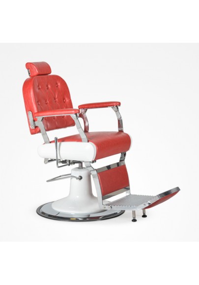 Sillón de barbero con bomba hidráulica y base redonda de metal.